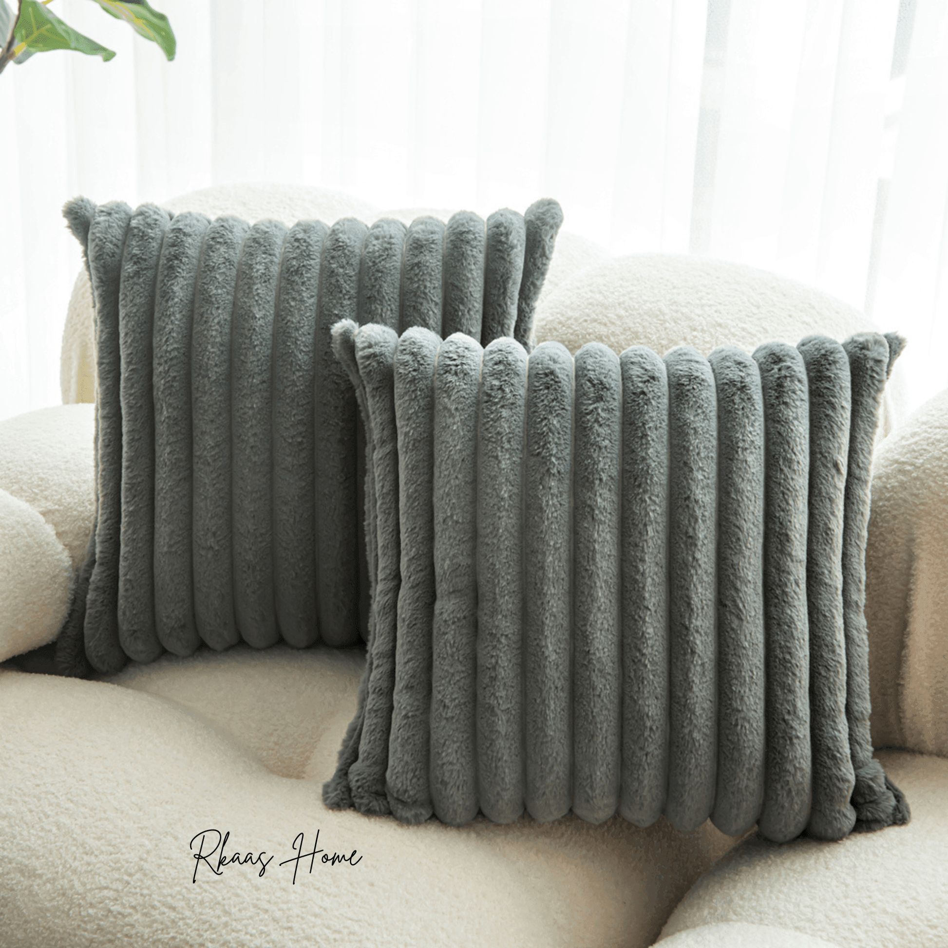 Die Rkaas Home Kissenbezüge im Format 45x45 cm verbinden weichen, flauschigen Kunstpelz mit einem Cordmuster in gestreiftem Design.